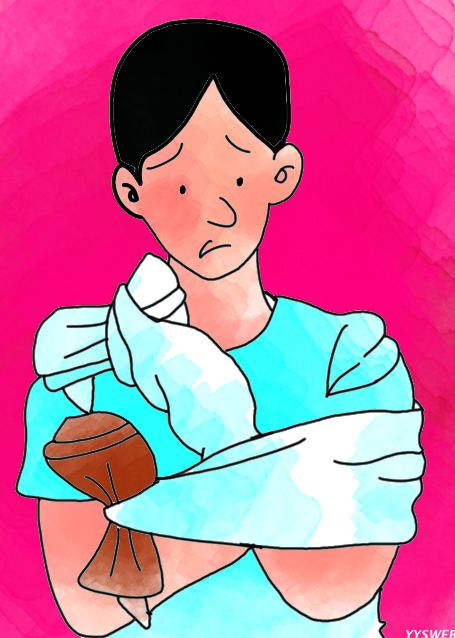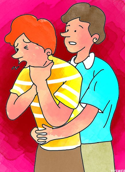 千万不能试图用手将堵塞物硬取出来或用水强迫冲下去。假如他的嗓子仍然堵住,迅速采取以下方法:站在他的背后,抱住他的腰,一手握成拳头,拇指一边靠在肋骨和肚脐间的肚皮上;另一只手抓住握拳的手上,快速向上猛压。如此反复多次,直到堵塞物出来为止。